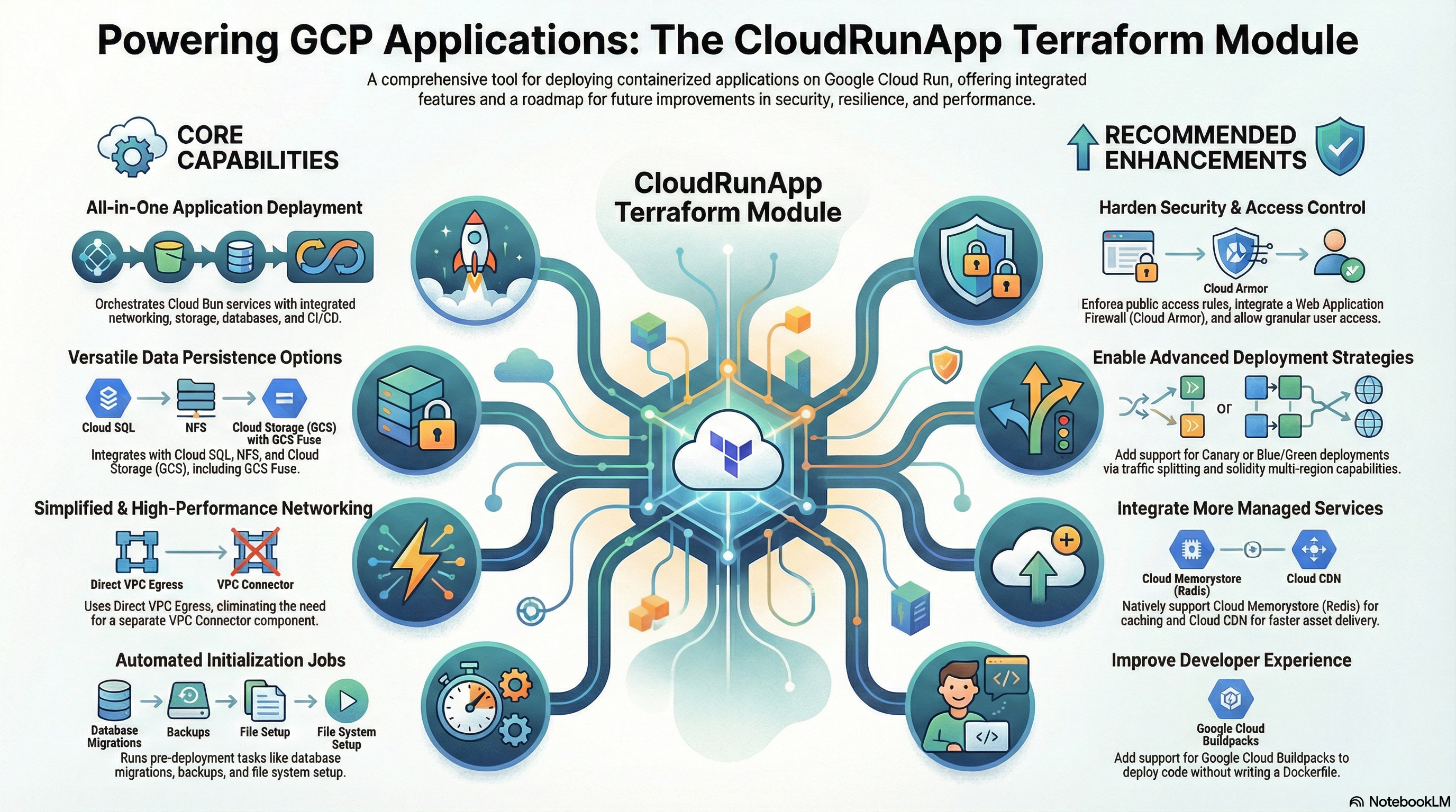 The CloudRunApp module is a foundational building block for deploying containerized applications on Google Cloud Run (v2). It is designed to be highly configurable and orchestrates not just the compute layer, but also the surrounding ecosystem of networking, storage, databases, and observability.