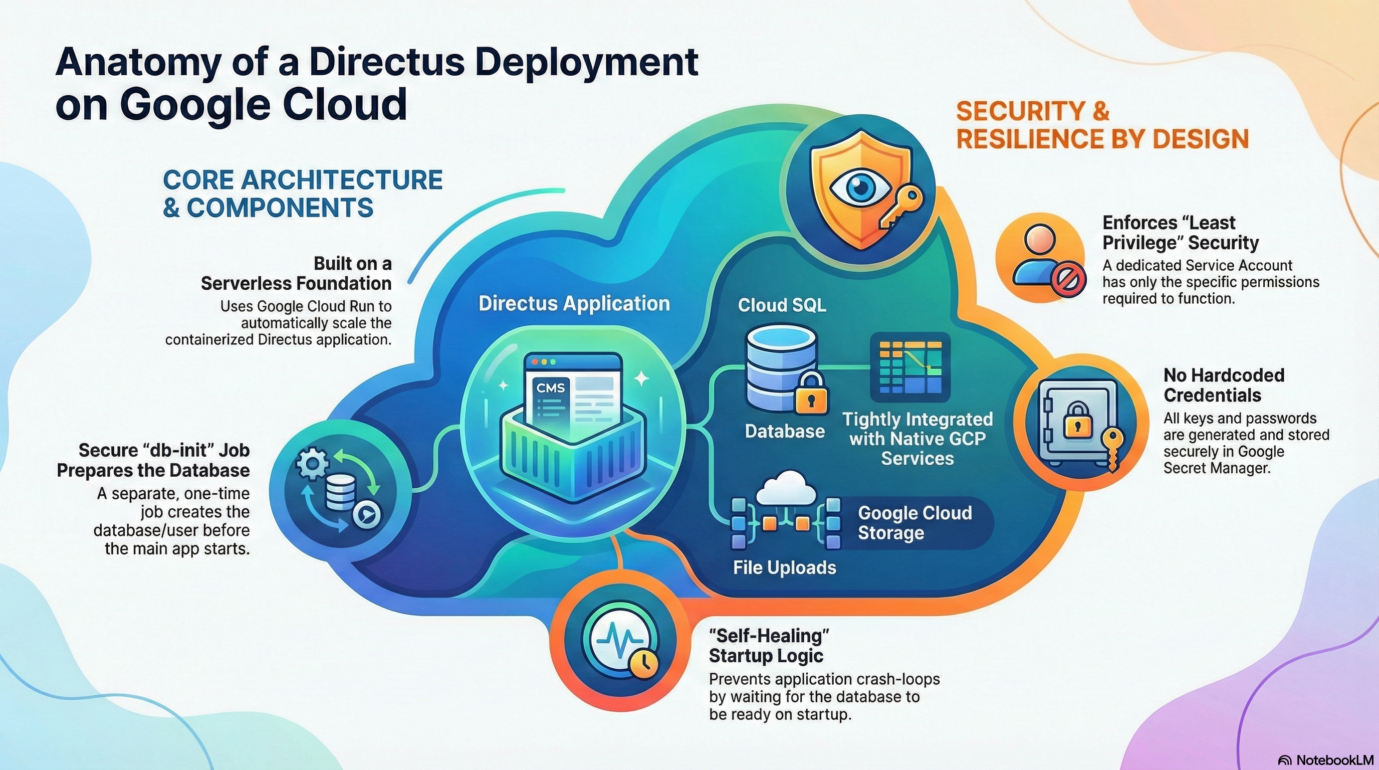 This document provides a comprehensive analysis of the Directus module implementation. It details the architecture, IAM security model, service configurations, and opportunities for enhancement.