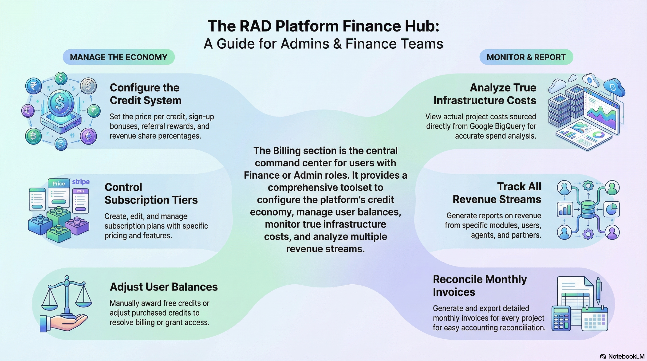 Welcome to the Finance Guide. This documentation is intended for users with the Finance role. This role provides specialized access to the Billing section of the application, as well as revenue reports and management capabilities for the platform's credit economy and subscription products.