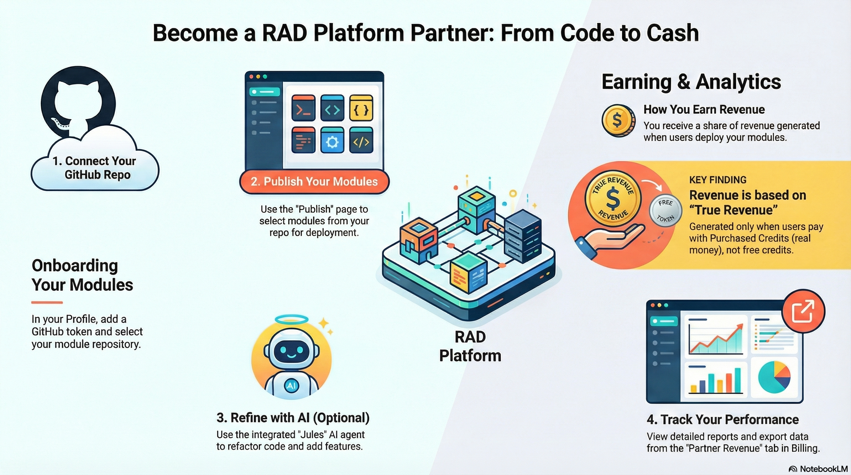 Welcome to the Partner Guide. As a Partner, you play a special role in the ecosystem. You have the ability to publish your own Private Modules and deploy them, in addition to the standard platform modules available to everyone. Your navigation bar includes Credits, Explore (if Jules AI is configured), Publish (once your repository is connected), Deployments, Deploy, ROI, and Help.