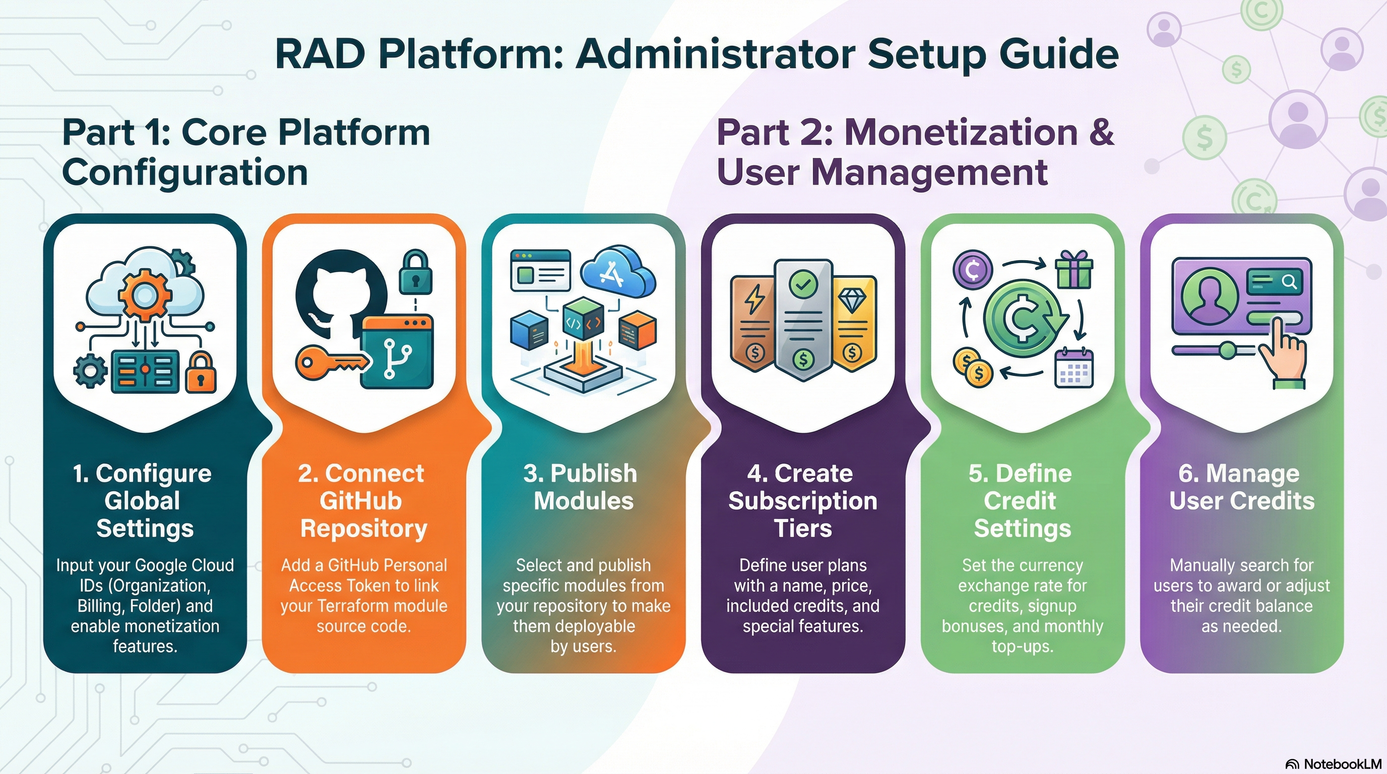 This tutorial covers the essential tasks for setting up a new RAD platform instance. You will configure global settings, connect the platform repository, publish modules, and configure monetization settings like subscription tiers and user credits.
